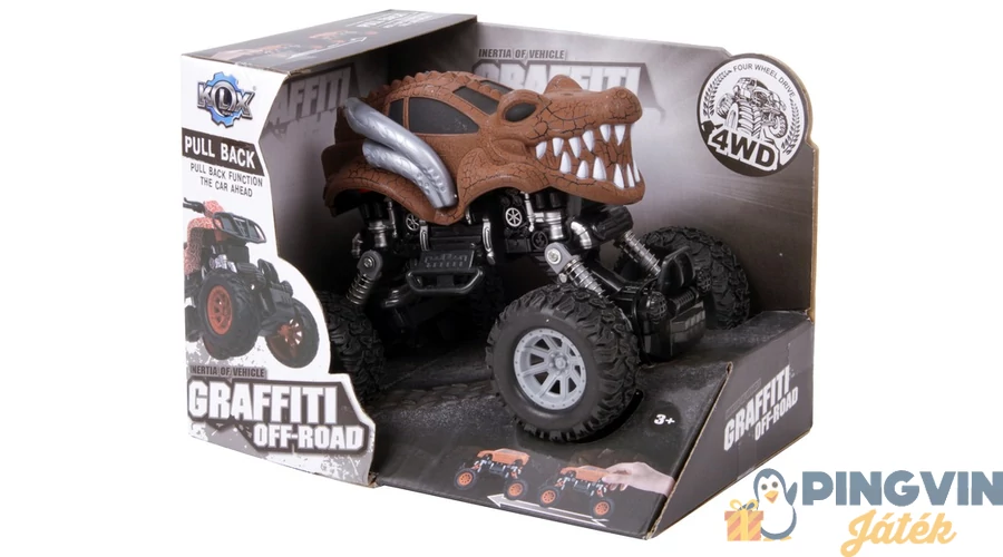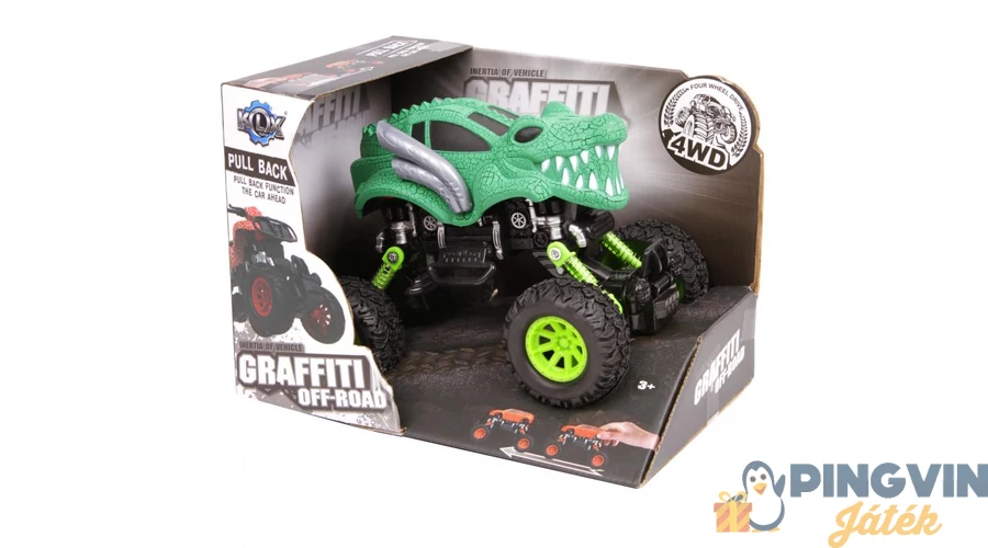 Hüllő karosszériás terepjáró autó, négy kerekes meghajtással! A Graffiti Off-Road terepjáró egy ijesztő dinoszauruszt, vagy állatot mintázó járgány, rugós felfüggesztéssel, műanyag karosszériával. Az autó hátrahúzós meghajtással készült, ha visszahúzod, majd elengeded, magától elindul, felgyorsul és messzire fog gurulni. A Graffiti Off-Road terepjáró vagány megjelenésű, és bármilyen akadályon könnyedén átgurul. Az autó méretei: 17 x 11 x 12 cm. A játékok külön kaphatóak. A megjegyzésben kérjük tüntesd fel, hogy melyik változatot szeretnéd!
